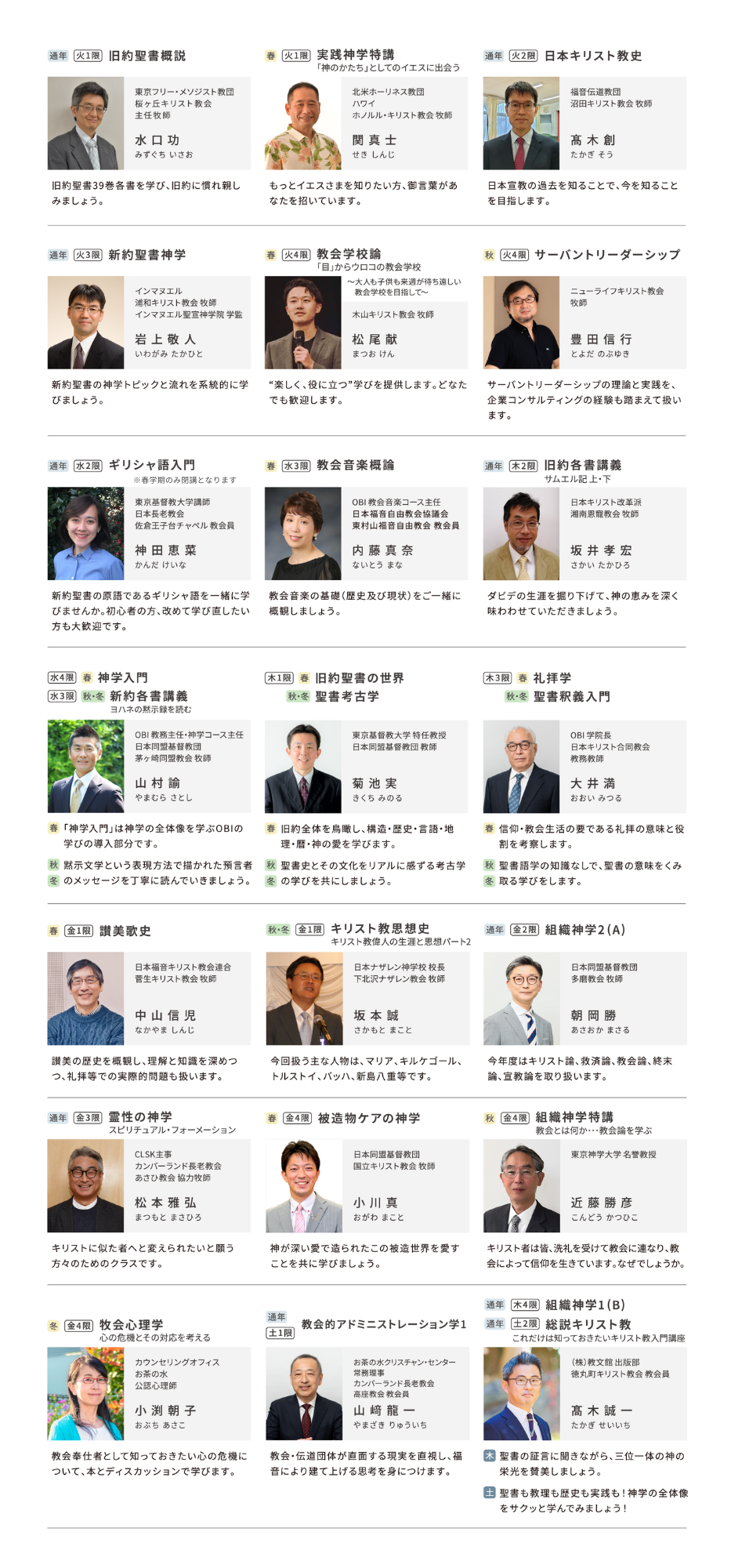 神学コース 教師紹介 神学コースの教師陣は福音主義的な教会で活躍する牧師,神学者,教育者,専門家です。諸教会の教会教育の働きを共に担う宣教協力として,幅広い教団教派の先生方にご協力いただいています。 〈2025年度 教師情報はこちら〉