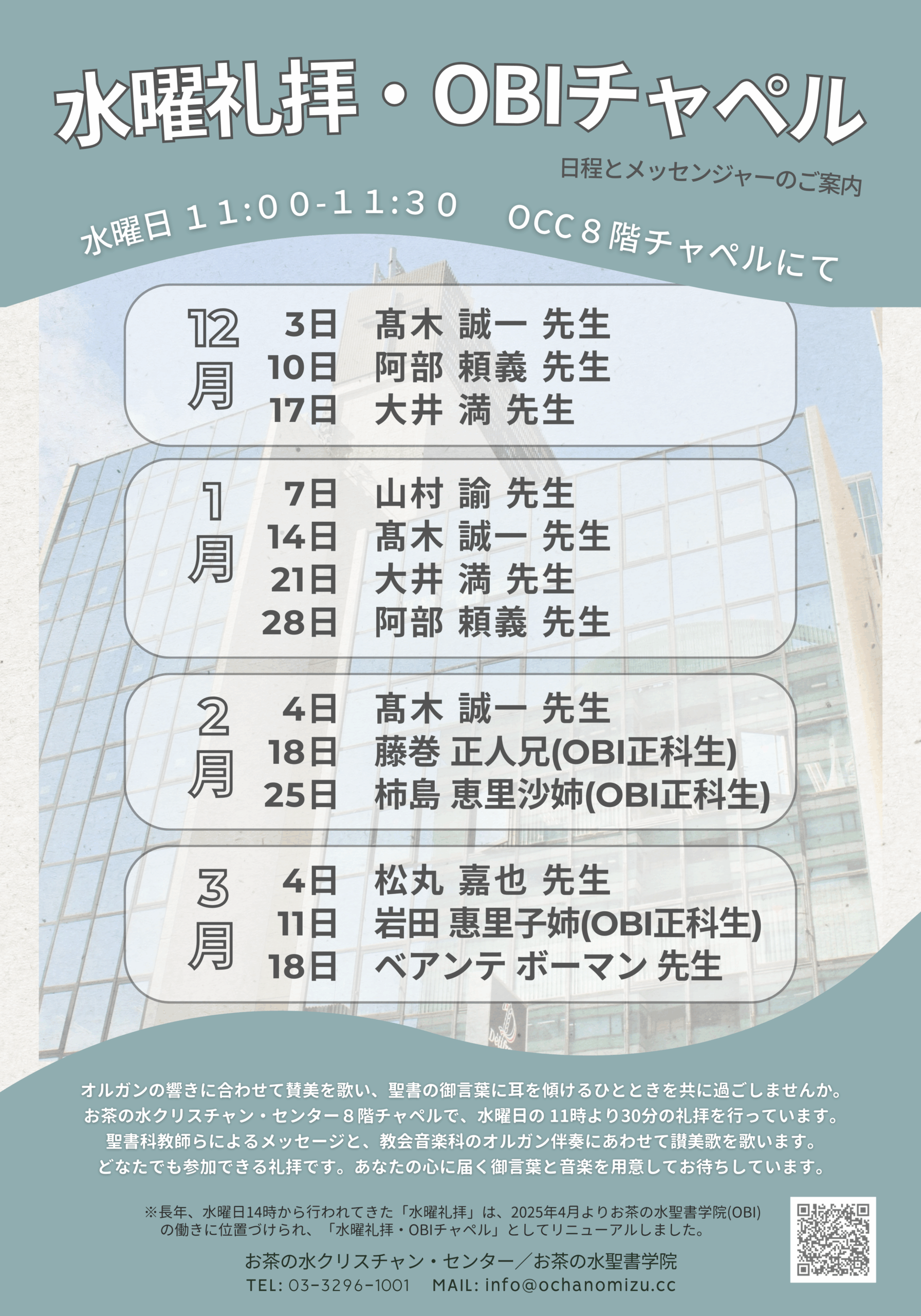 水曜礼拝・OBIチャペルのご案内(12-3月) 2025.11.27 Tweet Share Hatena Pocket RSS feedly Pin it 2026年度OBIパンフレットが発行されました